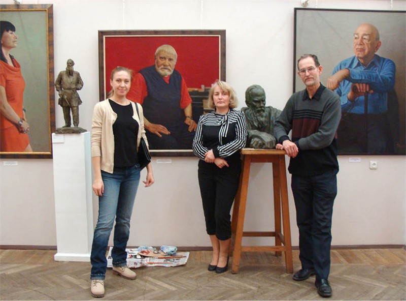 Работа над экспозицией персональной выставки А. Г. Толстикова «В зеркале портрета» в Мемориальном музее «Творческая мастерская С. Т. Коненкова» (слева направо: искусствовед, академик РАХ М. В. Вяжевич, директор Мемориального музея, член-корреспондент РАХ С. Л. Боброва, художник М. В. Горшунов). 2014