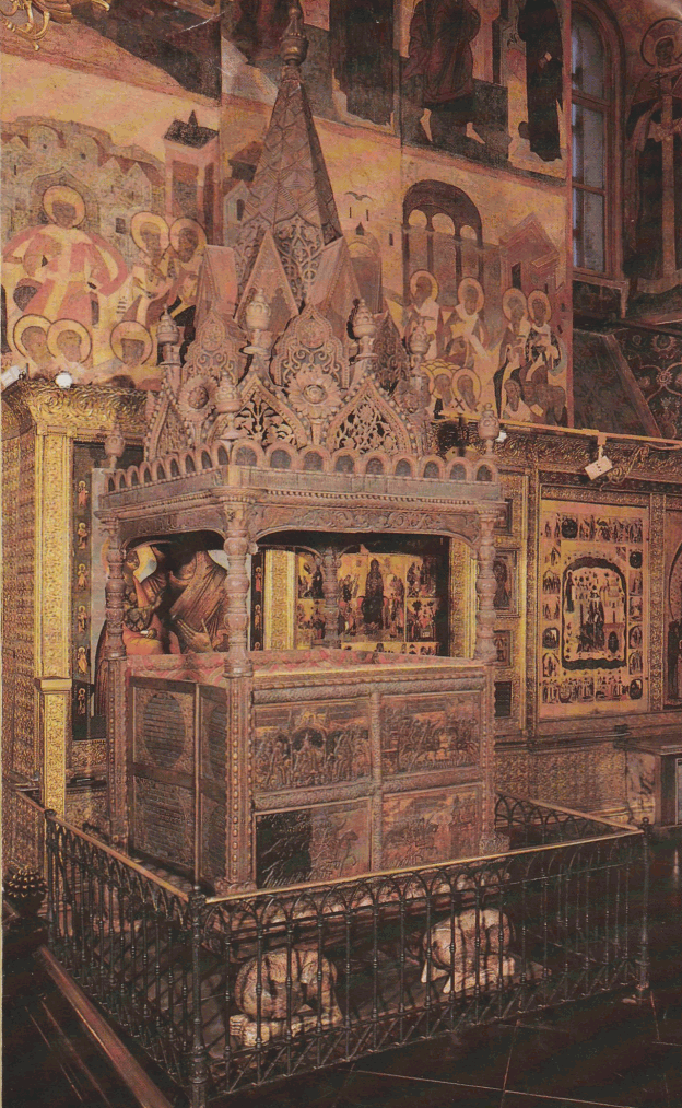В 1551 году по указу Ивана Грозного было создано царское моленное место, так называемый "Мономахов трон" - шедевр резьбы по дереву. Барельефы на его стенках иллюстрируют легенду о посылке византийским императором киевскому князю Владимиру Мономаху, чьим прямым потомком и наследником считал себя Иван Грозный, царских регалий - шапки Мономаха и барм.