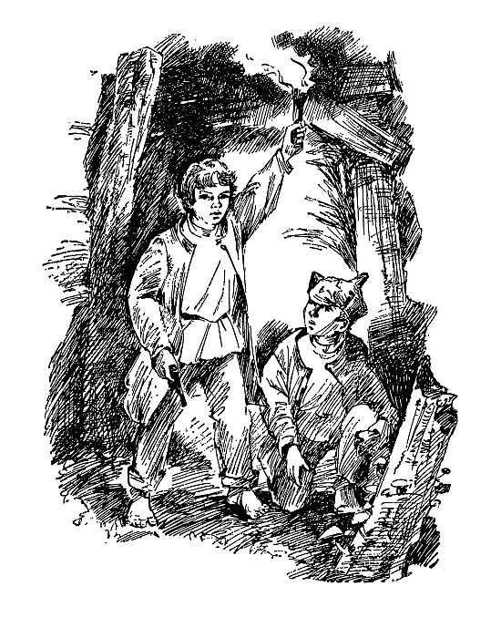 Яшка, нагруженный берестой, щепками и узелками с едой, спотыкаясь, семенил за своим товарищем. Ему был виден освещенный силуэт Пантушки, прыгающие по стене отсветы факела и тени. Тени принимали самые невероятные формы: то вдруг возникнет на стене лицо старика с бородой и начнет вытягиваться и разевать рот, то прыгнет что-то похожее на черепаху, на уродливую птицу, то начнет дрожать и извиваться, как змея, узкая черная полоса. Яшке временами казалось, что подземелье населено сказочными существами, которые боятся дневного света. Признаться, что ему страшно, Яшка не мог: боялся насмешек Пантушки.