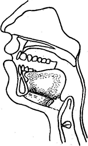 Звук О. Челюсть опущена на расстояние меньшее, чем при А (на полтора пальца), губы несколько вытянуты вперед и округлены, кончик языка опущен вниз и оттянут от нижних передних зубов, задняя часть языка несколько приподнята к мягкому нёбу.