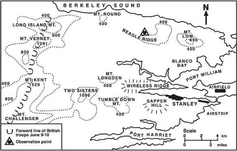 Мы срезали курс на север над поселком Дуглас и пролетели над Порт-Сальвадором. Луна ненадолго вышла и осветила дикую монохромную картину гладкой воды и резко изрезанной береговой линии. Затем мы снова двинулись на север, вдоль пролива Беркли над поселком Порт-Луи. Борттехник показал нам два пальца и мы ухватились за пряжки на наших страховочных ремнях. Когда Мартин резко повернув направо и зайдя очень низко и быстро к востоку от Маунт-Раунд с позициями противника на ней, свернул в лощину на земле, резко сбросив ход. Впереди из темноты замигал сигнал от неяркого фонаря команды SAS из четырех человек, которые находились в этом районе с прошлой недели. Мартин рванул назад и приземлился; мы быстро выгрузились со своим снаряжением. После короткого громкого разговора с принимающей командой, я махнул рукой пилоту. Мартин тронулся с места, борттехник помахал рукой, поднял вверх большой палец, и они полетели на север, к черной воде пролива Беркли, очень низко и очень быстро.