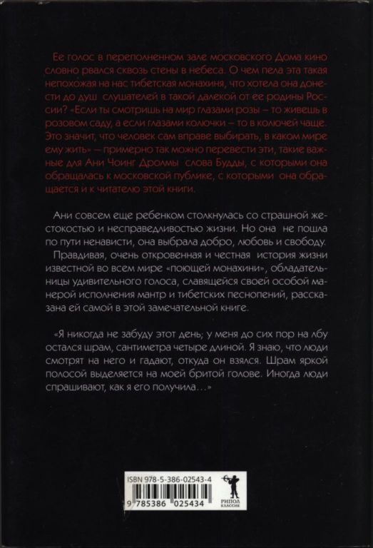 Ее голос в переполненном зале московского Дома кино словно рвался сквозь стены в небеса. О чем пела эта такая непохожая на нас тибетская монахиня, что хотела она донести до душ слушателей в такой далекой от ее родины России? «Если ты смотришь на мир глазами розы — то живешь в розовом саду, а если глазами колючки — то в колючей чаще. Это значит, что человек сам вправе выбирать, в каком мире ему жить» — примерно так можно перевести эти, такие важные для Ани Чоинг Дролмы слова Будды, с которыми она обращалась к московской публике, с которыми она обращается и к читателю этой книги.