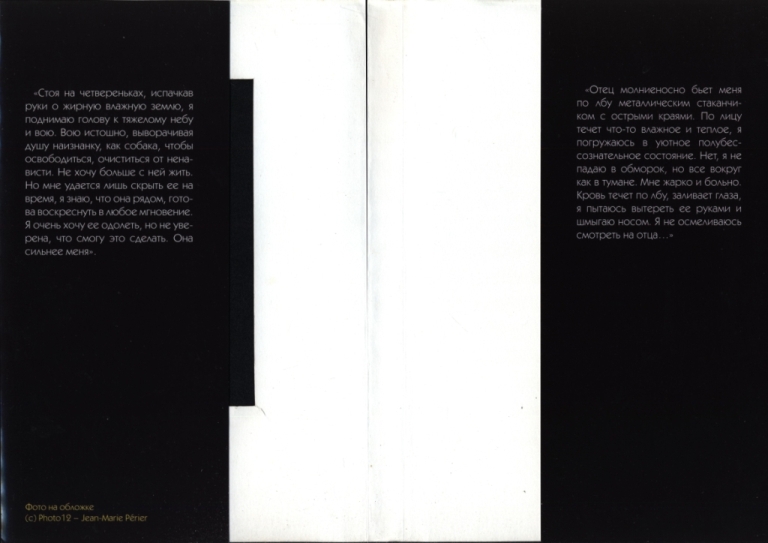«Стоя на четвереньках, испачкав руки о жирную влажную землю, я поднимаю голову к тяжелому небу и вою. Вою истошно, выворачивая душу наизнанку, как собака, чтобы освободиться, очиститься от ненависти. Не хочу больше с ней жить. Но мне удается лишь скрыть ее на время, я знаю, что она рядом, готова воскреснуть в любое мгновение. Я очень хочу ее одолеть, но не уверена, что смогу это сделать. Она сильнее меня».