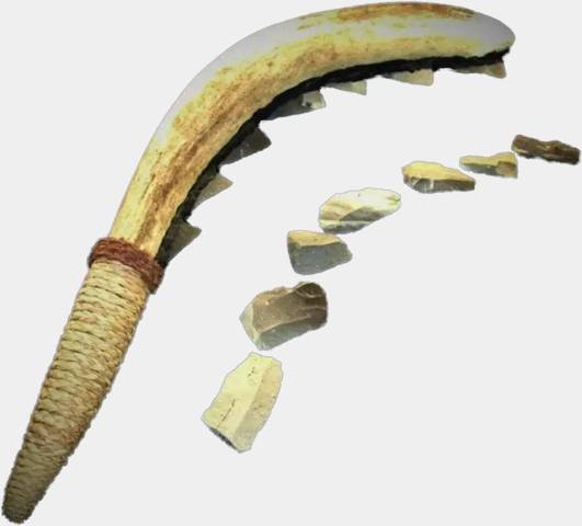 Вторым инструментом стал серп. Для него я нашёл короткую, изогнутую и достаточно упругую палку, которую можно было расщепить вдоль, не расколов при этом на две половинки. В расщеп вставил острые пластинки кремния, которые дерево моментально зажало.