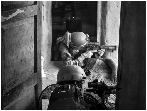 Джордж, Билли и Марк заняли позиции в угловой комнате, ближайшей к грунтовой дороге. Вспышки выстрелов пульсировали из, казалось бы, случайных позиций в пределах первого ряда зданий на северной оконечности Кибчака. Места были названы по радио, когда члены команды пытались нанести удар по непрерывно перемещающимся боевикам.