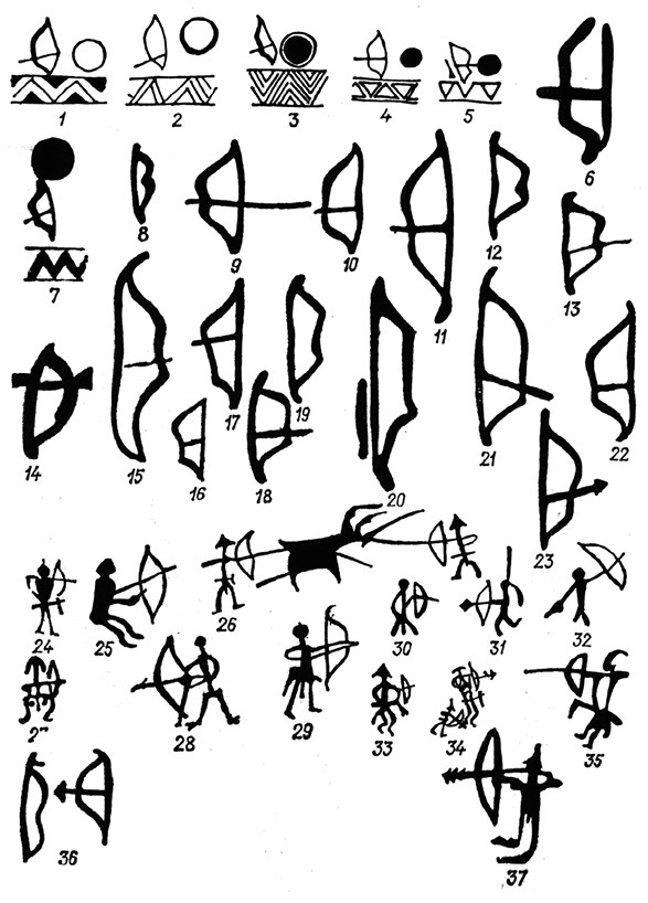 Луки и стрелы на оленных камнях (1–23) и петроглифах (24–35, 37) Монголии