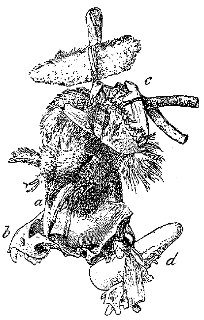 Рис. 49. Связка охранителей: а — воронья голова, Ь — лисий череп, c — изображение собаки, d — камень, изображающий землю.