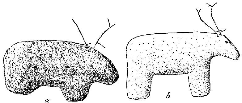 Рис. 64. Жертвоприношения, представляющие оленей: a — фигурка, сделанная из толченых листьев, b — фигурка, сделанная из снега.