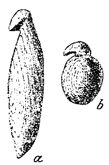 Кроме оленей и собак, чукчи приносят «духам» и другие жертвоприношения. В первую очередь должны быть отмечены «заменные» жертвоприношения. Это — маленькие фигурки оленей, сделанные из жира, толченого мяса, из ивовых листьев или из других растений и корней, употребляемых в пищу (рис. 64, a), или даже из снега (рис. 64, b). Зародыши оленей, извлеченные из чрева убитой оленьей самки, употребляются для той же цели, и некоторые из них откладываются для больших праздников. [127] Употребляют также почки оленя и своего рода колбасы, представляющие собою третий желудок оленя, начиненный мясом и жиром. Иногда даже деревянное изображение такой колбасы считается достаточным жертвоприношением (рис. 65). Это является уже двойной заменой. Предполагается, что каждый «заменный» предмет является подобием настоящего оленя. Поэтому почку или колбасу иногда ударяют ножом, как бы убивая их. Кровь жертвоприношений считается лакомством «духа». Небольшое количество крови льют в огонь, разбрызгивают ее по всем «направлениям», по которым приносится жертва, и, как это будет описано ниже, обмазывают ею священные предметы, которые также должны получать жертвоприношения. Кровь или жир наливаются в маленькие чашечки, вырезанные из выделанной кожи. Они ставятся на снег по «направлениям», получающим жертвоприношения. Сало, жир, костный мозг, вареное мясо, толченые листья и корни бросают по всем «направлениям», получающим жертву, закапывают в землю или же кладут в огонь. Лица огнивных досок обмазывают салом или костным мозгом. Иногда кровью жертвы разрисовывают нарты. Все другие предметы, употребляемые чукчами в пищу, также служат жертвоприношением. Большинство из них, конечно, животного происхождения. «Чужая пища», полученная посредством торговли и высоко ценимая чукчами, также приносится в жертву «духам». Оленные чукчи покупают у приморских охотников необходимые им для жертвоприношений китовое мясо и моржовый жир, а приморские охотники в обмен на это получают от оленеводов оленье мясо и сало. И оленеводы и приморские чукчи довольно охотно приносят в жертву «духам» продукты, получаемые из цивилизованных стран, а именно: табак, сахар, муку, хлеб и даже водку. Но водку они приносят духам в жертву лишь по нескольку капель.