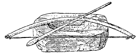 Обычно при жертвоприношениях kelet употребляют сажу. Ее бросают по направлению к западу. Предполагается, что kelet употребляют сажу для постройки своего очага. В жертву kelet приносятся также игрушечные лук и стрела (рис. 66), которые кладутся в маленький, грубо вырезанный жертвенный сосуд. Такие жертвы приносятся главным образом во время эпидемии какой-нибудь заразной болезни. В этот сосуд кладутся также кусочки пищи. По объяснению туземцев, такое жертвоприношение означает, что человек, поднесший kelь лук, просит его охотиться где-нибудь в другом месте. Жертвоприношение делается в полночь, жертву относят на некоторое расстояние от дома в западном направлении и кладут там в снег.