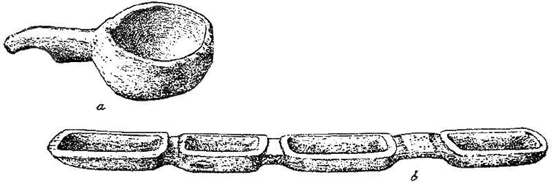 Часто жертвоприношения приносятся в обыкновенной посуде. У чукоч, однако, очень распространено употребление специальных жертвенных сосудов. Большинство из них — простые, обычной величины деревянные миски (рис. 67, а). Они отличаются своим старым, подержанным видом. Употребляются также миски миниатюрных размеров. Жертвенные сосуды специальной формы встречаются реже. Рисунок 67, b представляет сосуд, предназначенный для жертвоприношений всем «направлениям». Четыре отдельные сосуда служат для жертвоприношений четырем основным «направлениям», получающим жертвы, т. е. Рассвету, Полдню, Зениту и Надиру — по порядку слева направо. Другие сосуды того же рода имеют только два отделения: одно — для Рассвета, другое — для Вечера.