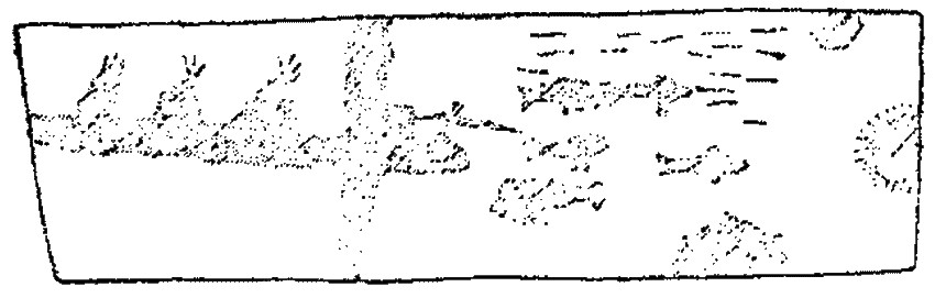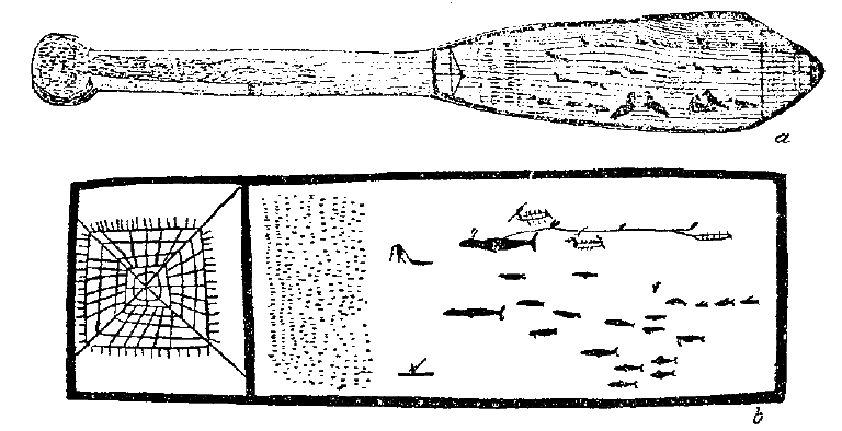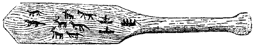Разрисовка весла, взятого из эксимосского поселка U?asik (рис. 78), изображает, в противоположность предыдущему, тундренных зверей: оленей, волков, и лисиц. За ними гонятся, очевидно, по воде, байдара и два каяка. Семья, употреблявшая эту доску, считалась, однако, настоящей приморской семьей. На другом весле, взятом также из U?asik’a (рис. 79, а), изображены морские звери и различные сцены охоты на них. В верхней части рисунка расположена группа людей, занимающихся шаманством. Двое из них бьют в бубны, два других пляшут обрядовую пляску. Этот рисунок оказывает магическое действие на морского зверя, привлекая его к берегу. Оба конца рисунка снабжены несколькими полукруглыми линиями, которые, очевидно, изображают настороженные луки, хотя туземцы не могли дать никакого объяснения по этому поводу. Другая сторона весла-доски (рис. 79) украшена узором из прямых линий и маленьких полукругов в эскимосском стиле.