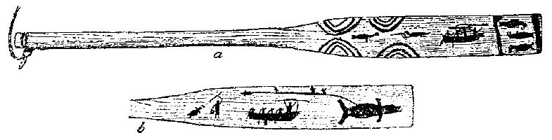 Рис. 75. a — обрядовое весло, b — доска с рисунками.