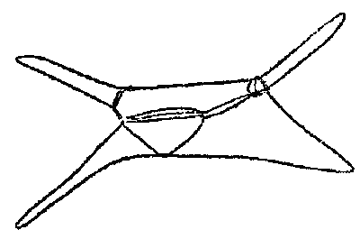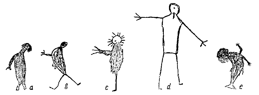 Я привожу несколько рисунков, изображающих духов этого рода. Рисунок 2, а — озерный дух (gьtgь-kal), дух маленького озера, лежащего неподалеку от морского берега, близ устья Анадыря. У духа — тело тюленя и человеческие руки, голова косматая. Он вышел из озера стоймя. Рисунок 2, b — дух бухты Креста; у него одна трехпалая рука. Рисунок 2, с — дух Анадырского лимана. Волосы у него на голове стоят дыбом и, также как у предыдущего, у него только одна трехпалая рука. Мне говорили, что дух среднего течения Анадыря — одноглазый, и руки у него тоже о трех пальцах. Так он и изображен на рисунке 2, d. У него вертикальный разрез рта, один глаз и трехпалые руки. Рисунок 2, е — морской дух (a?qa-kal) с рыбьим телом и с огромной косматой головой. Другой рисунок, не помещенный здесь, изображает большого морского духа с длинными волосами на голове и на заду.