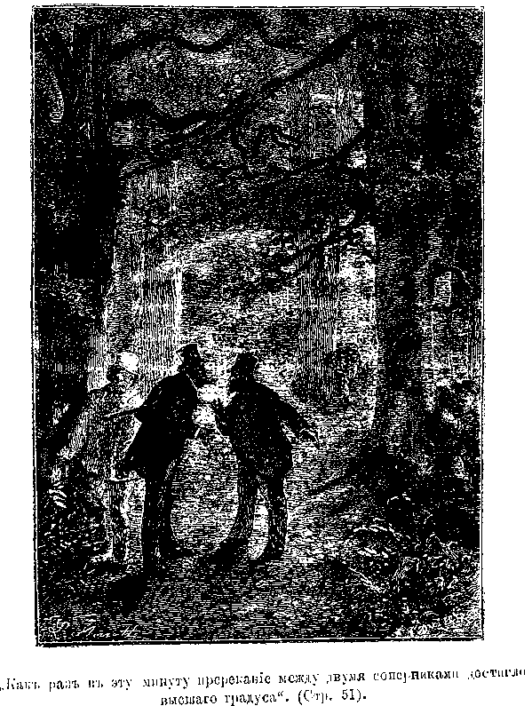 Вс? трое очутились въ самой середин? густой купы деревьевъ, вершины которыхъ обливались посл?днимъ св?томъ заходящей луны.