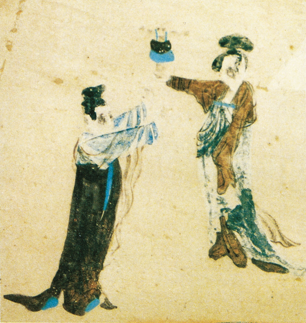 На танской фреске «Блага, обретенные за следование с радостью» на сюжет из «Лотосовой сутры» на северо-восточной стене 31 пещеры комплекса Могао изображены две молодые девушки высотой двадцать сантиметров. Одна девушка держит перед собой куклу, а вторая хочет ее отнять. Кукла, изображенная на фреске, – ранняя тростевая марионетка на деревянных прутьях (чжантоу муоу), хотя некоторые полагают, что это перчаточная кукла (будай муоу).