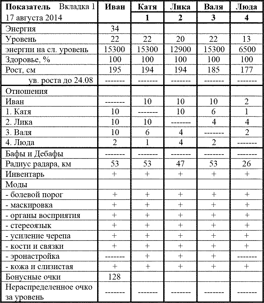 На вечернем совещании присутствовали все. Лику, после комплексного обследовали, признали ограниченно годной к продолжению несения нашей службы. Из-за этой ограниченности, я, на всякий случай, опять обделил её поднятием Уровня. Вслед за Людой, Энергия 14 197 (-5 800), Уровень я поднял Вале, Энергия 97 (-14 100).