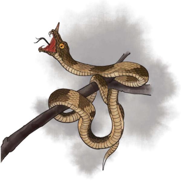 (1) Змея Фучун: в древних источниках – разновидность гадюки. У змеи есть клыки, её тело покрыто цветными полосками. Некоторые предполагают, что это щитомордник.
