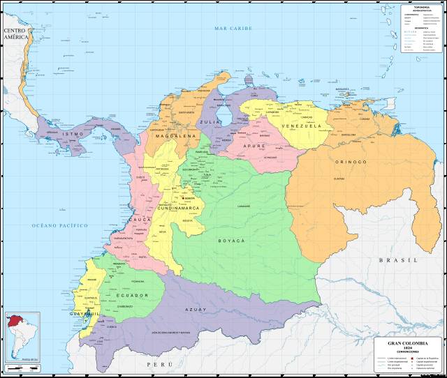 «Великая Колумбия» — республика, появившаяся вместо вице-королевства «Новая Гранада» в первой четверти XIX века, как осколок распавшейся Испанской империи. Но ведь не зря древние латиняне первыми изрекли «разделяй и властвуй» — и дробление пошло дальше, ведь периоды распада таковы, особенно когда многие хотят получить пусть маленькое, но собственное «княжение». А там идут «полураспады», особенно когда значительно внешнее влияние и воздействие, и получается большой набор насквозь коррумпированных «банановых республик», постоянно стравливаемых «мировыми игроками» между собой, чтобы никогда «испанский мир» не смог бы прийти даже к «моральному объединению»…