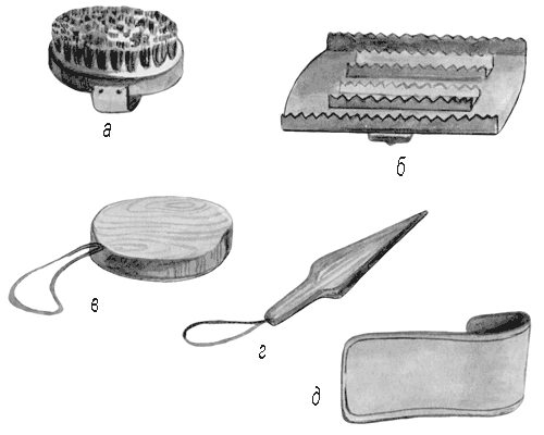 Предметы ухода за лошадью: а – щетка; б – скребница; в – деревянная колодка; г – деревянный нож; д – суконка.