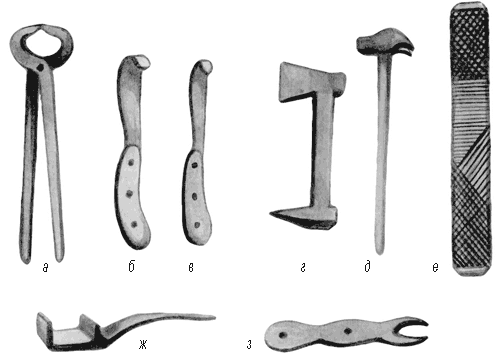 Ковочный инструмент: а – ковочные клещи; б – секач; в – обсечка; г – копытный нож; д – ковочный молоток; е – нашпиль; ж – лапа; з – шиповой ключ.