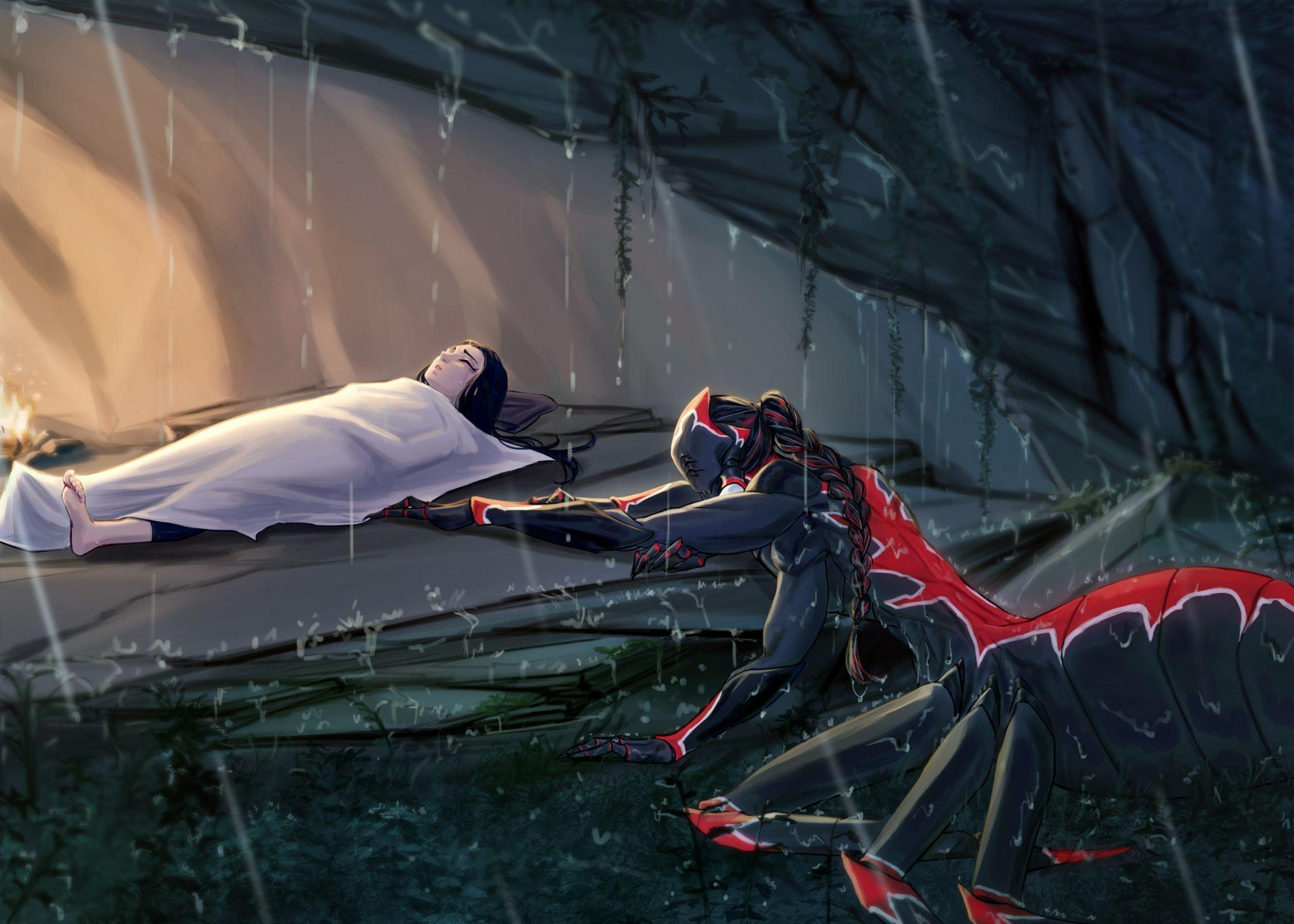Когда Кетан открыл глаза, свет костра на потолке пещеры был приглушенно-красным, как догорающие угли. Тихие разговоры ранней ночи сменились стуком дождя по окружающим джунглям. Прохладный воздух коснулся его шкуры — по крайней мере, там, где она не была прикрыта одеялами или его парой.