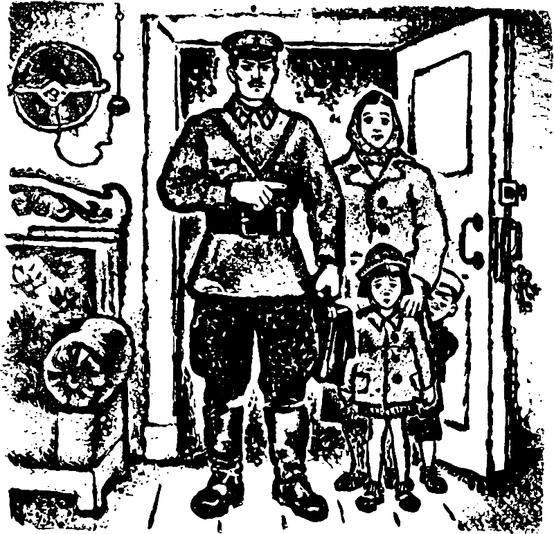 Мы увидели, как в комнату вошел капитан из военкомата, тот самый, с усиками, а за ним знакомая нам женщина с двумя детьми.