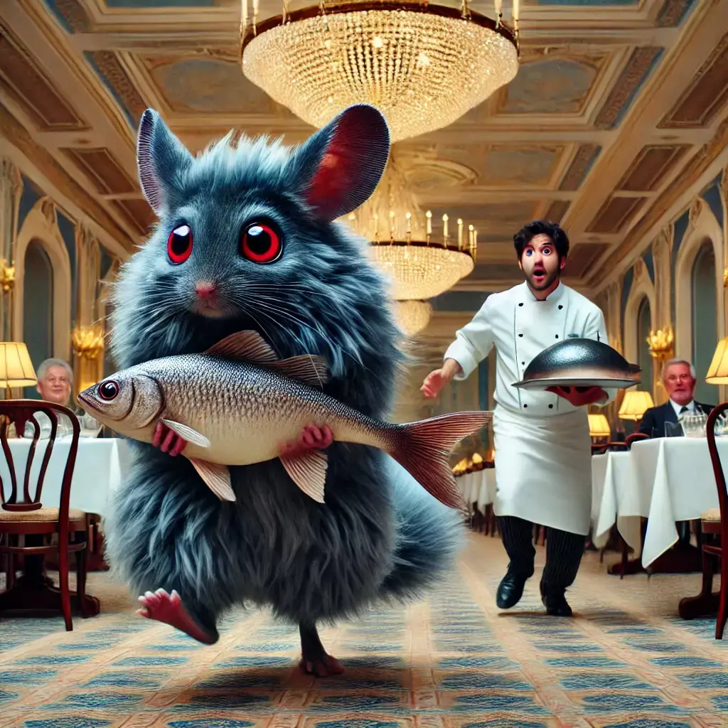 Менеджер вовремя заметил девушку-азиатку и двинулся ей наперерез, но когда до неё оставалось всего лишь пару метров, что-то ухнуло на кухне, и в зал ворвалось нечто пушистое, таща за собой целую рыбину. Животное ловко запрыгнуло на портьеру и устремилось вверх, а из кухни показался повар с половником.