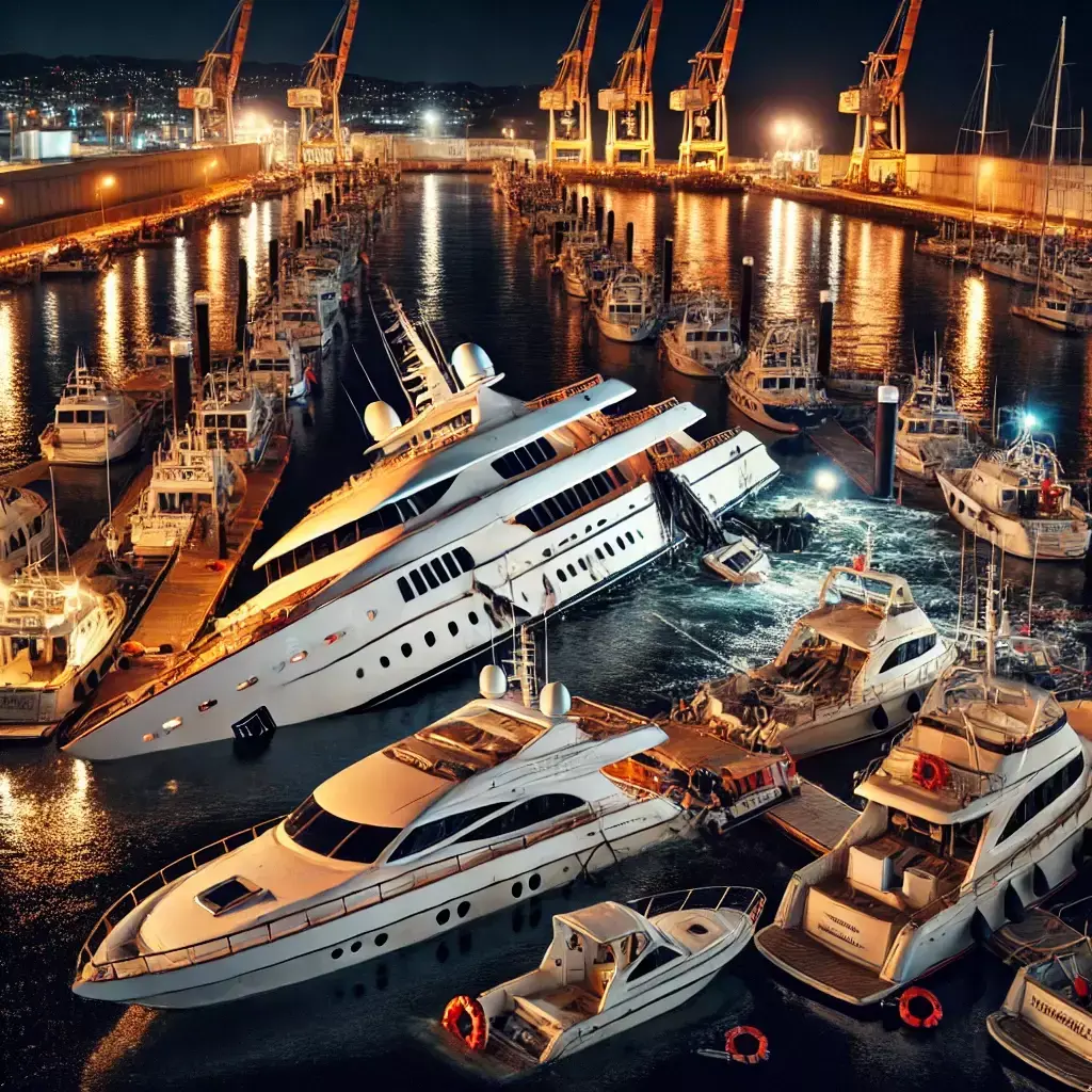 На фотографии была видна накренившаяся на бок его яхта среди множества других, а вокруг суетились пожарные и полицейские, а недалеко стояли машины скорой помощи.