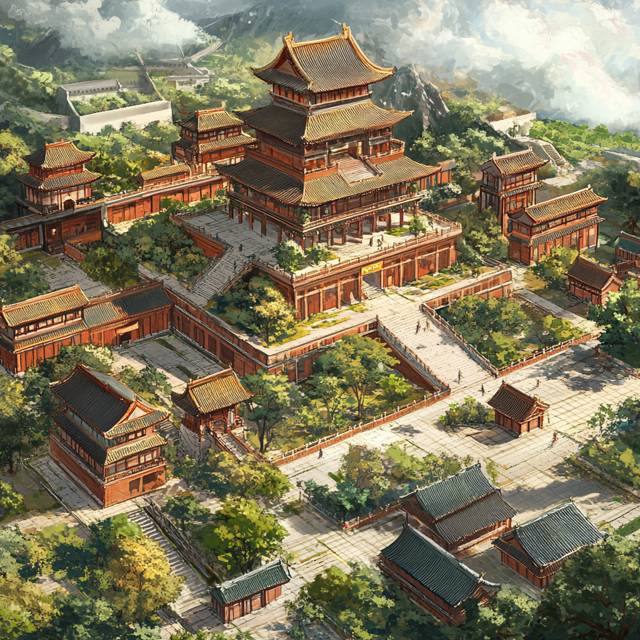 За открытыми вратами оказалась широкая аллея, выходящая на площадь. Перед площадью стояла на небольшом возвышении большая пагода, а с разных сторон от аллеи, а также с других сторон от площади стояли довольно крупные деревянные постройки в китайском стиле.