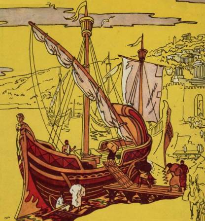 Наконец тройка либурн пришвартовалась у причала. Первой — «Диана», за ней «Морской конь» и «Бродяга морей». С кораблей первыми, позвякивая кольчугами и держа руки на рукоятях мечей, сошли телохранители. Распугнув своим угрюмым видом зевак собравшихся поглазеть на неожиданных гостей. За ними неторопливо и важно спустились одетые в тоги юноши и в сопровождении слуг. Один из них что-то приказал телохранителю и тот, отпустив рукоять меча, двинулся к зевакам. Подойдя поближе, он остановился, сунул руку в кошель и громко спросил на койне с небольшим акцентом.
