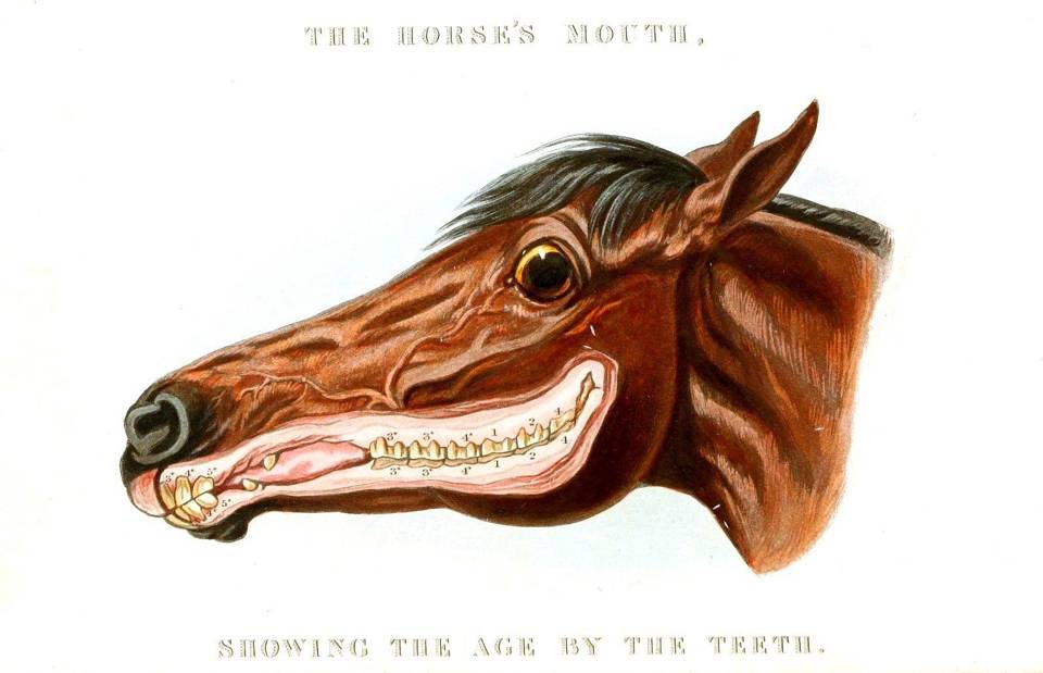 (Вот обычная лошадь. А у нашей острые зубы, и нет щёк.)