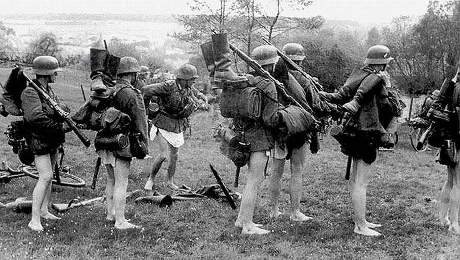 Так вот, во-вторых, проклятые фашисты и преодолевать водную артерию, если этому капилляру подходит гордое звание артерии, собрались не по-людски. Смотрелось из кустов это безобразие как наиотвратитльнейший порнофильм для самых отбитых. Представьте себе: стоит в колонну по одному отделение натуральных фашистов в форме и в касках, с винтовками и всякими прочими противогазами-термосами. Но стоит оно без штанов, без трусов и босиком, потрясывая мудями. А штаны и сапоги висят на винтовках.