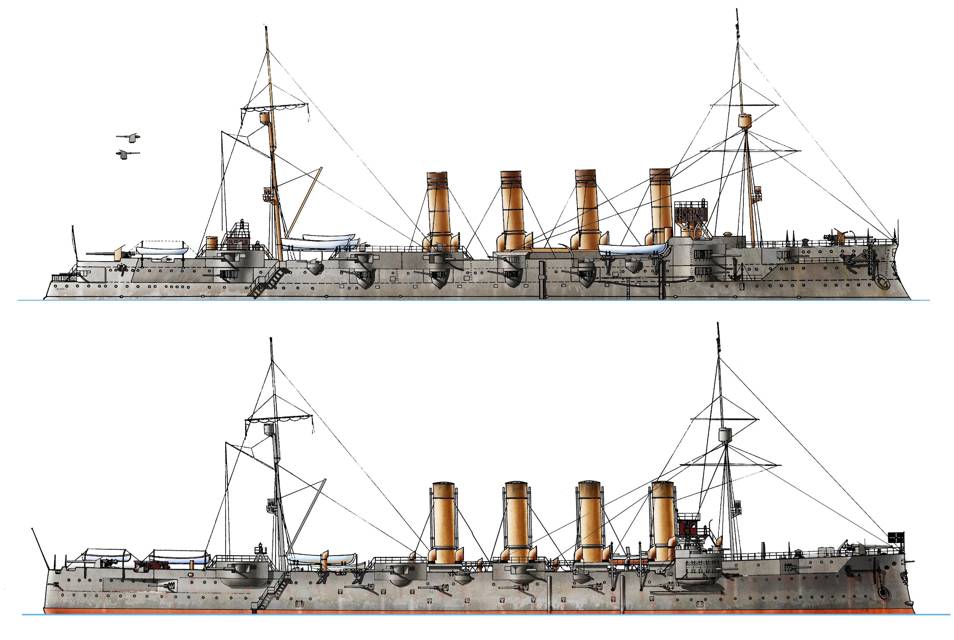 Броненосный крейсер «Громобой» после постройки и модернизации (перед войной с японцами и в годы 1-й мировой войны) — в первом случае превалируют крейсерские, во втором уже больше эскадренные качества. Изменившийся состав вооружения и некоторое улучшения в бронировании сразу заметны, но их лучше было бы внедрить еще в 1903 году, как предлагали некоторые разумные моряки…