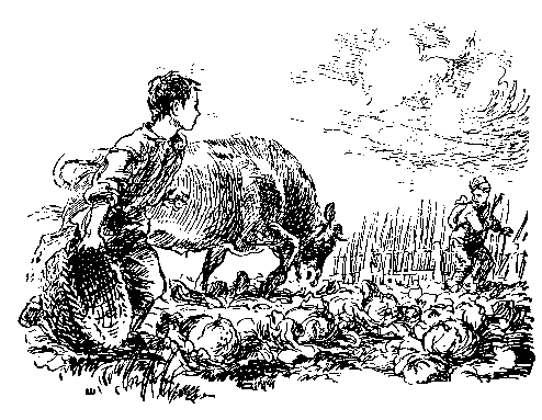 Прибежал Петька с пастухом. Стреляя, как из ружья, длинным кнутом, пастух выгнал быка с участка.
