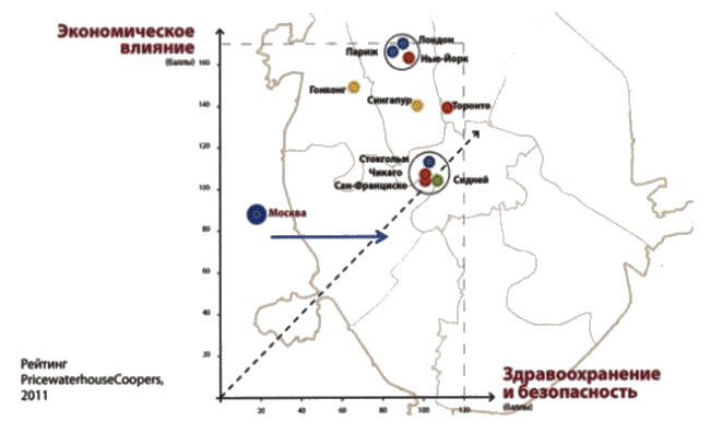 Диаграмма выстроена по статистике компании PricewaterhoseCoopers, которая использовала стандарты европейского здравоохранения и безопасности. Так что по «мировым стандартам» Москва при высоком уровне экономического влияния выпадает даже из группы городов-гигантов типа Стокгольма или Сиднея.