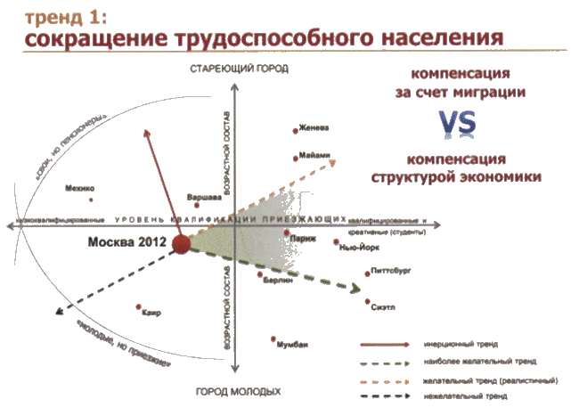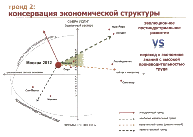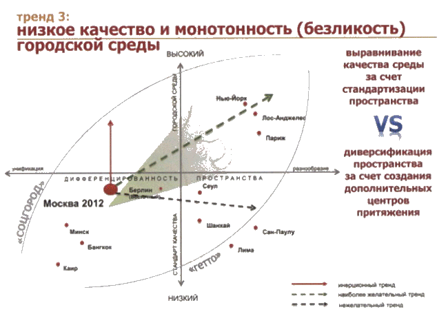 И такое пространство с насаженными тривиальными сюжетами, пораженное низкой плотностью коммуникации и тромбозом транспортных горловин, не позволяет Москве достойно светиться на ветви городов-сверхгигантов…