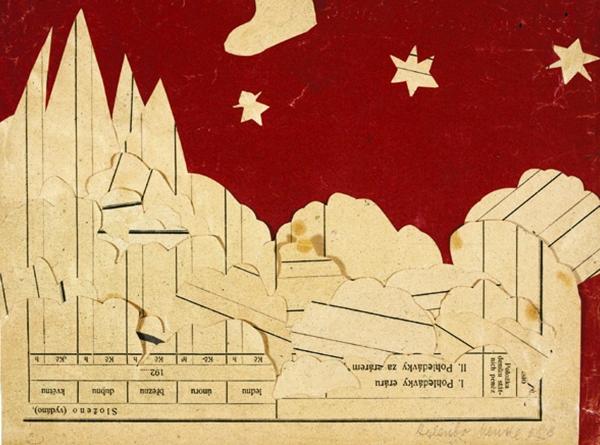 Хелена Мандлова (21.5.1930—18.12.1943). «Градчаны». 1943. Эту девочку в детском доме травили. В терезинском дневнике Хельги Поллак (Кински) она описывается как нечестная, жадная и злая (глаза-буравчики). Девочки комнаты № 28, где жила Хелена, мечтали от нее избавиться. Когда Хелену депортировали, они не высказали никакого сожаления. Скорей всего, Фридл была единственной, кто относился к Хелене по-доброму. Она давала ей задания, требующие вдумчивости и усидчивости. Многослойный коллаж из обрезков лагерных бланков безупречен по ритму и композиции. Вырезая и наклеивая обрезки на красную бумагу, Хелена успокаивалась. «Пражский град» – сублимированный образ: он одинок и вознесен в небо, над ним облака и звезды.