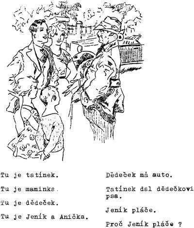 «Это папочка. Это мамочка. А это дедушка. Это Еник и Аничка. У дедушки есть машина. Папочка дал дедушке собаку. Еник плачет. Почему Еник плачет?» «Прага на столе. Снаружи холодно, дома тепло. Еник играет. На столе стоят дома, дом подле дома. На столе улица. И деревья. На столе уже целая Прага».