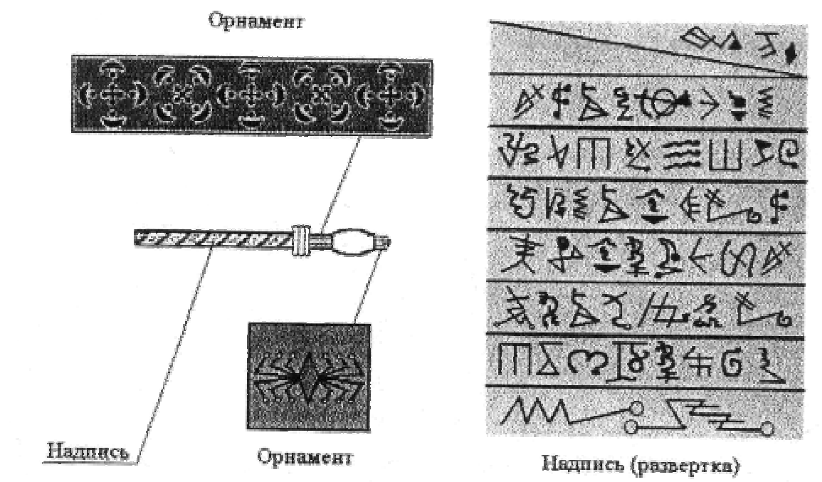 Надпись между витками линии состоит из букв, не относящихся ни к кельтской письменности, существование которой до сих пор не доказано, ни к какому либо из известных вариантов рунического алфавита. Повторение некоторых символов заставляет предполагать, что здесь используется некая магическая письменность, но так ли это, и если так, то каково её происхождение, исследователям оккультизма до сих пор неизвестно.