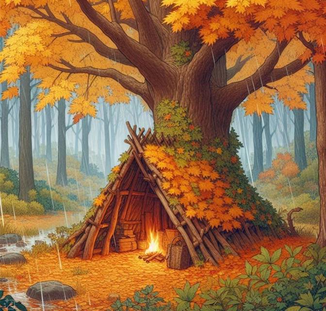 Оказавшись вдали от жилья в такое ненастье, люди принялись бы рубить колья и лапник. Эльфы же умели устроиться, причиняя лесу гораздо меньше вреда. Выбрав клён, окружённый подростом, Утарион прочной верёвкой связал макушки тонких молодых деревьев и стянул их к толстому стволу: получился не слишком просторный, но вполне уютный шалаш. Так как осенние листья держались уже не слишком крепко и не могли служить надёжной защитой от дождя, сверху на ветки склонённых деревьев накидали толстым слоем опавшую листву, крепя её подобранным на земле лапником. Листовым опадом щедро засыпали и пол будущего укрытия.