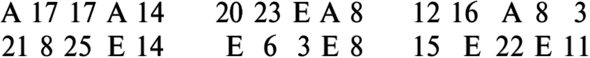 Первая последовательность «19 17 17 19» необычна. 19, как и 8, второе по частоте встречаемости число в сообщении. 17 встречается в два раза реже. Не может быть четырех гласных или четырех согласных подряд (кроме как в немецком), то есть либо 17 — гласная, 19 — согласная, либо наоборот. Поскольку 19 встречается чаще (четыре раза), она скорее может оказаться гласной, чем 17 (которая встречается только дважды). После Е самая частая гласная — А. Пусть 17 — А, тогда получаем: