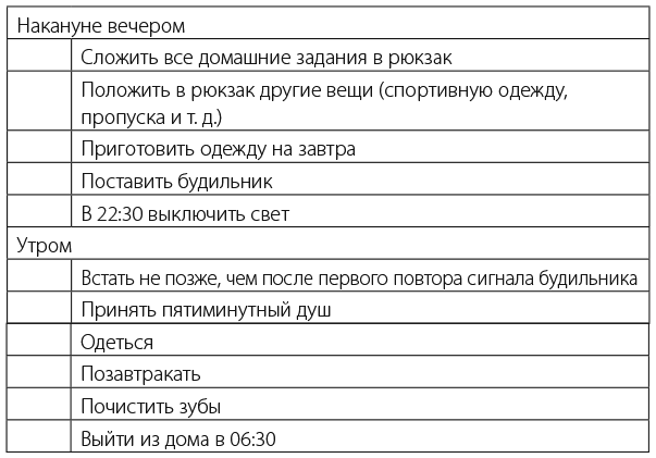 Разрабатывая план, вместе с ребенком подумайте, есть ли у вас какая-то роль в его осуществлении. Дети, которые терпеть не могут придирок, зачастую охотно принимают напоминания, если это часть плана, который они помогали разрабатывать. Джейк, например, может попросить отца, чтобы тот зашел к нему в десять часов вечера и сказал, что до отхода ко сну надо просмотреть список. Если вы согласитесь участвовать в реализации плана, включите свою функцию в список (например, «Чтобы помочь мне выполнить этот план, мои мама или папа будут [или не будут — в зависимости от того, что последует дальше] __________»).