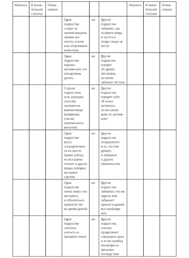 Для каждого элемента в таблице сначала решите, какое утверждение слева или справа от «но» лучше описывает вашего подростка. Затем оцените, в какой степени это утверждение применимо к вашему подростку. Количество пунктов, для которых вы выбрали утверждение справа, показывает, насколько ребенку нужно улучшить навык в целом. Ваши оценки указывают на возможные цели для развития навыков: если вы выбрали «в значительной степени» или «очень сильно» для высказывания в левой колонке, ваш подросток демонстрирует хорошее использование навыка в этой конкретной области; «в значительной степени» или «очень сильно» в правой колонке указывает на области, которые, возможно, нуждаются в наиболее тщательной проработке.