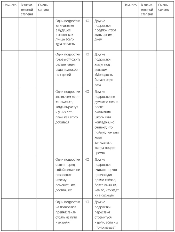 Для каждого элемента в таблице сначала решите, какое утверждение слева или справа от «но» лучше описывает вашего подростка. Затем оцените, в какой степени это утверждение применимо к вашему подростку. Количество пунктов, для которых вы выбрали утверждение справа, показывает, насколько ребенку нужно улучшить навык в целом. Ваши оценки указывают на возможные цели для развития навыков: если вы выбрали «в значительной степени» или «очень сильно» для высказывания в левой колонке, ваш подросток демонстрирует хорошее использование навыка в этой конкретной области; «в значительной степени» или «очень сильно» в правой колонке указывает на области, которые, возможно, нуждаются в наиболее тщательной проработке.