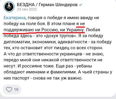Рис. 3. Шендеров исполняет партию меротворца 23.09.2022. И в таком ключе – все его посты. Герр Герман считает, что россияне как нация не виноваты. Более того, украинцы тоже не виноваты, что на них напали. Парфёнов, зыришь, приблудок?