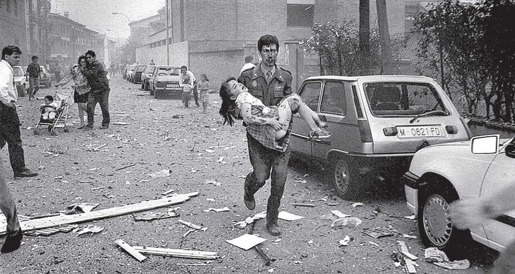 Перед глазами у меня тотчас всплыла фотография, появившаяся в газетах в тот же день. Кажется, это было в Сарагосе. Фотография из тех, которые потом невозможно забыть: на фоне разбросанных повсюду обломков и плывущего зловещего дыма идет гвардеец с окровавленным лицом в форме, из-под которой виднеется галстук, гвардеец несет на руках девочку лет семи-восьми с раздробленной ногой, и на ее лице отражается только боль, просто боль. От таких черно-белых фотографий нельзя оторвать глаз. Чуть дальше стоит супружеская пара: муж обнимает жену, вцепившуюся в ручки прогулочной коляски, где сидит годовалый, не старше, младенец, но он-то благодаря этому не запомнит ничего из виденного и слышанного. Чуть в стороне от них застыл мужчина (наверное, отец), закрывающий руками ребенка лет четырех-пяти, с ними рядом – девочка побольше держится вполне уверенно. Но все же в первую очередь мне запомнился молодой гвардеец – или пожарный – с ребенком. И хотя лицо у него залито кровью (его собственной или чужой, покрывающей также руку спасенной им девочки) и она мешает различить черты, взгляд его выражает смесь решимости и глубокого потрясения, возможно, еще и гнева, но прибереженного на будущее, а также – сомнение в реальности происходящего. И решимость спасти изувеченную девочку, хотя на нее он не смотрит, устремив взгляд вперед, судя по всему, на санитарную машину, до которой надо дойти как можно скорее. Глубокое потрясение? Причин для него могло быть много: и то, что он не сумел предупредить эту трагедию, и зрелище невыносимой беды, и ужас, испытанный детьми, которые жили в этих казармах и пока еще мало что понимали, и гибель товарищей. Помнится, чуть позднее ЭТА со страниц своих печатных изданий и устами своих пропагандистов попыталась свалить вину на родителей пострадавших детей (чтобы обелить террористов): если бы гвардейцы не поселились в домах-казармах вместе с семьями, не было бы жертв среди малолетних; это, мол, сами гвардейцы прятались за детьми, как за живым щитом, подвергая их опасности. Террористы прекрасно понимали, что убийство детей вредит их репутации. Но только не в глазах фанатичных сторонников, которые с восторгом встречали любые их акции и требовали новых – ведь позднее всегда можно будет найти им оправдание, и найти без труда. По-настоящему трудно дается лишь первый шаг, а он был сделан еще много веков назад, и каждый следующий шаг – это уже естественное движение вперед, надо лишь передвигать одну ногу за другой и не останавливаться.