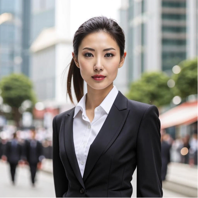 Азиатка, лет за тридцать, острые скулы, черные волосы, стянутые в хвост резинкой, одетая в брючный костюм, белая рубашка.