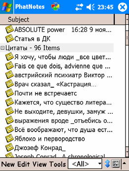 На Пальме тоже было нечто подобное – Natara Bansai называется (писал о ней в весенней «Голубятне»). Однако рядом с ListPro пальмовый аналог смотрится тенью отца Гамлета. Назначение ListPro – работа со списками любой длины. Бесконечное количество фильтров, сортировка по любому полю, десятки шаблонов, сотни готовых баз данных в интернете (добрая душа, Роман Исаев, «в знак того, что мы (ранее убогие адепты PocketPC, зла на Вас не держим», даже сконвертировал для старого голубятника в формат ListPro справочник по астрологии!), тонкая настройка сигнальных оповещений (алармов), наконец, гибкая и удобная синхронизация с собственным Windows-десктопом – всё это ставит ListPro практически вне конкуренции в классе hi-end.