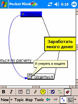 Года четыре назад я поминал в «Голубятнях» программы, пытающиеся моделировать деятельность мозга (на примитивном уровне, разумеется) и заменить традиционную папочную структуру ПИМов свободной архитектурой, характерной для полета мысли. Яркий образец такой программы TheBarin. Так вот, оказалось, что за прошедшие годы это направление в софтостроении эволюционировало в серьезную отрасль под названием CAMM (Computer Aided Mind Mapping – компьютерно-облегченная интеллектуальная картография). Поскольку КПК, по умолчанию, как раз тот самый «компьютер», что всегда под рукой, сам бог велел, чтобы для мобильных устройств были разработаны порты CAMM. Что и не преминуло произойти. Самой интересной реализацией, на мой взгляд, оказалась JKRB Software Pocket MindMap – очень удобная программа для брейнсторминга и формализации мыслительного процесса: